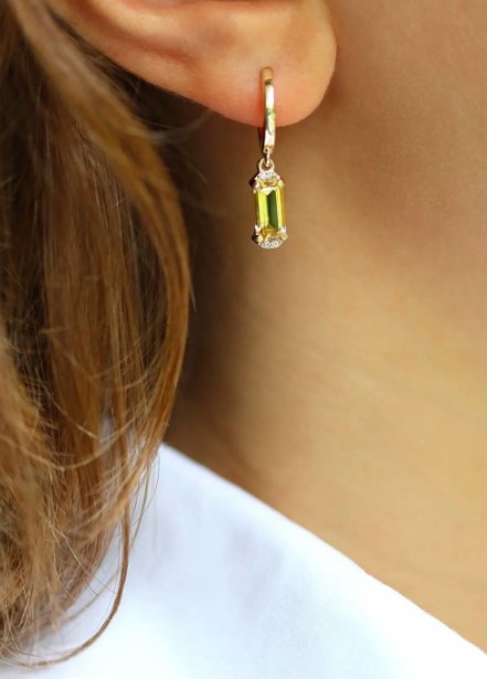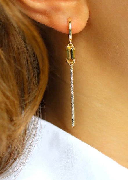 Le Côté Long: Reprenant la même Citrine octogonale, cette boucle d’oreille est prolongée par une délicate tige pavée d’oxydes de zirconium, créant une ligne allongée qui capte la lumière et sublime votre port de tête.
